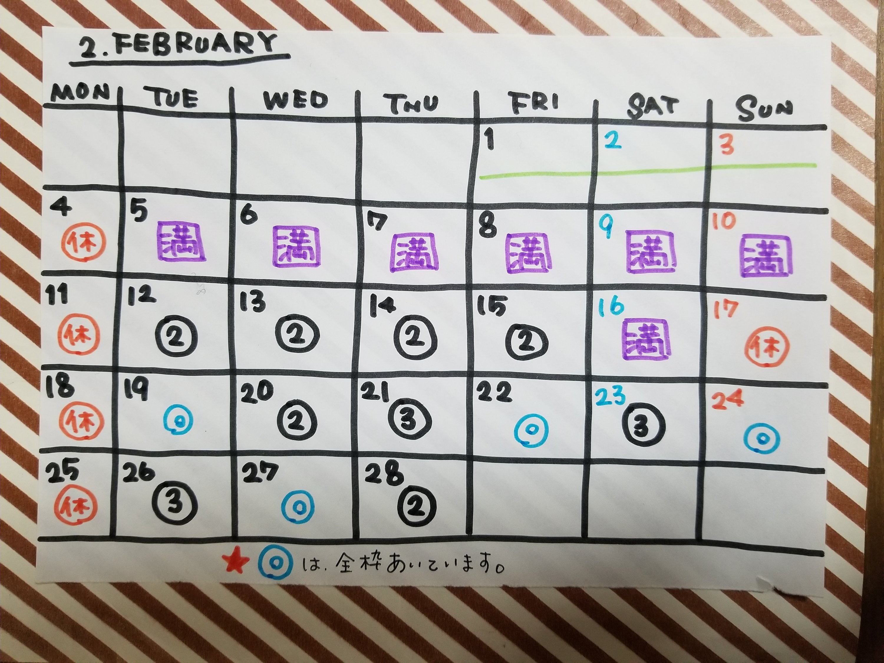 | « ご予約状況(2019年1月28日~2月28日) | ご予約状況(2019年1月22日~2月17日) » |