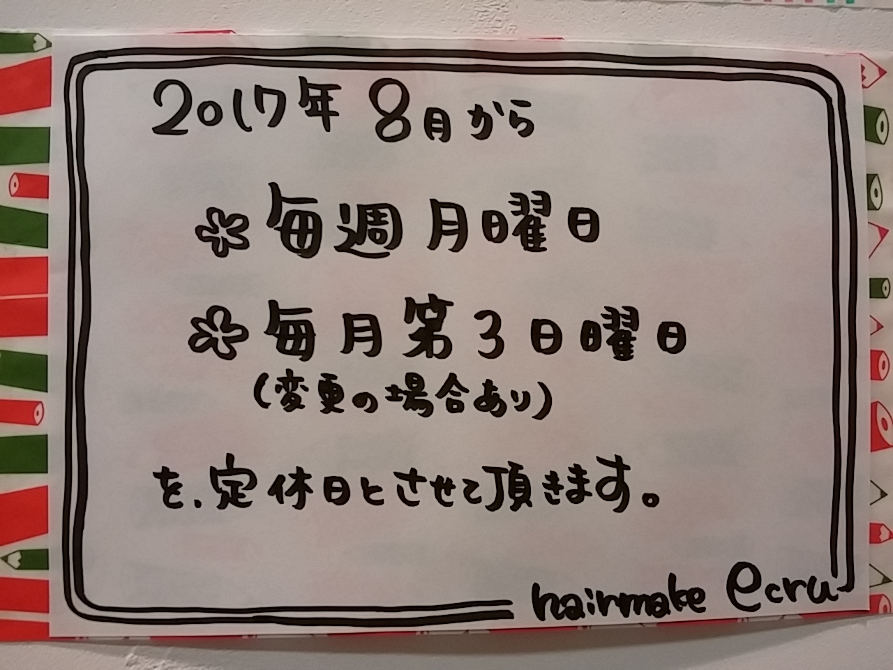 いつもご愛顧頂き、ありがとうございます。 2011年4月17日にオープンしてから丸6年経ち 7年目を迎えることができました。 心より感謝申し上げます。 そこで、今後私の見聞を広げることと、 健康を維持し、より良い状態で お客様に技術を提供することを目的に、 定休日を増やすことにいたしました。 今でもご希望に添えず、ご迷惑をお掛けしていることも度々ございますが、 これからも長く、長く、皆様に喜んで頂くお店を続ける為に、 ご理解頂ければ大変有難く思います。 改めて、これからもよろしくお願い致します hairmake ecru やまなかあいこ