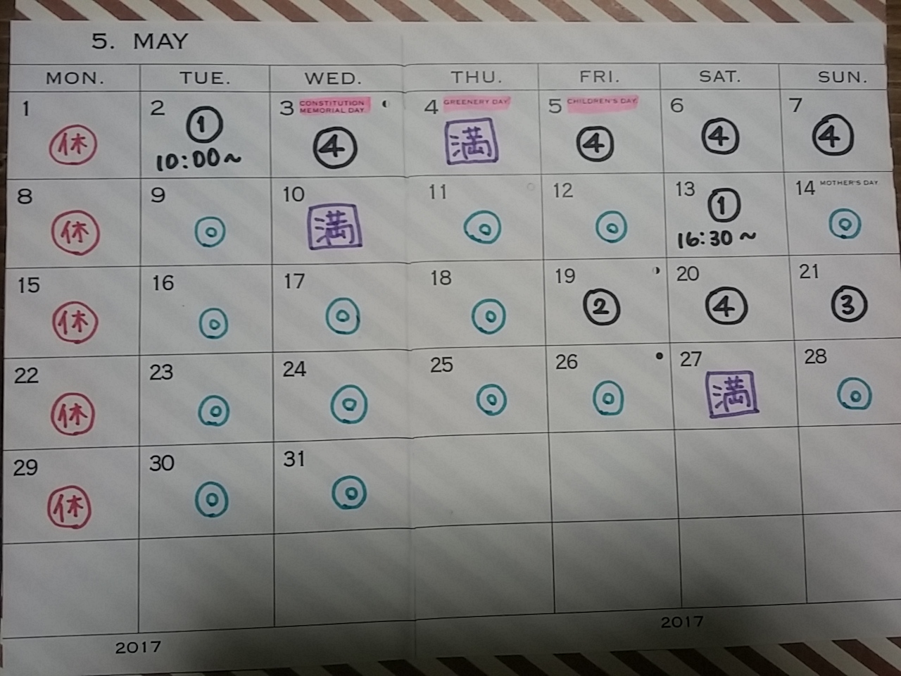 前回の記事では沢山のご理解のお声を頂きました。 皆さんに「休まなあかんで〜」と言って頂いたお言葉、嬉しいです!素直に甘えます! ありがとうございます! さて、ご予約状況ですが、4月中は満席となりました。 5月はまだまだ空きがございます。 お待ちしております(*˙︶˙*)ノ゙