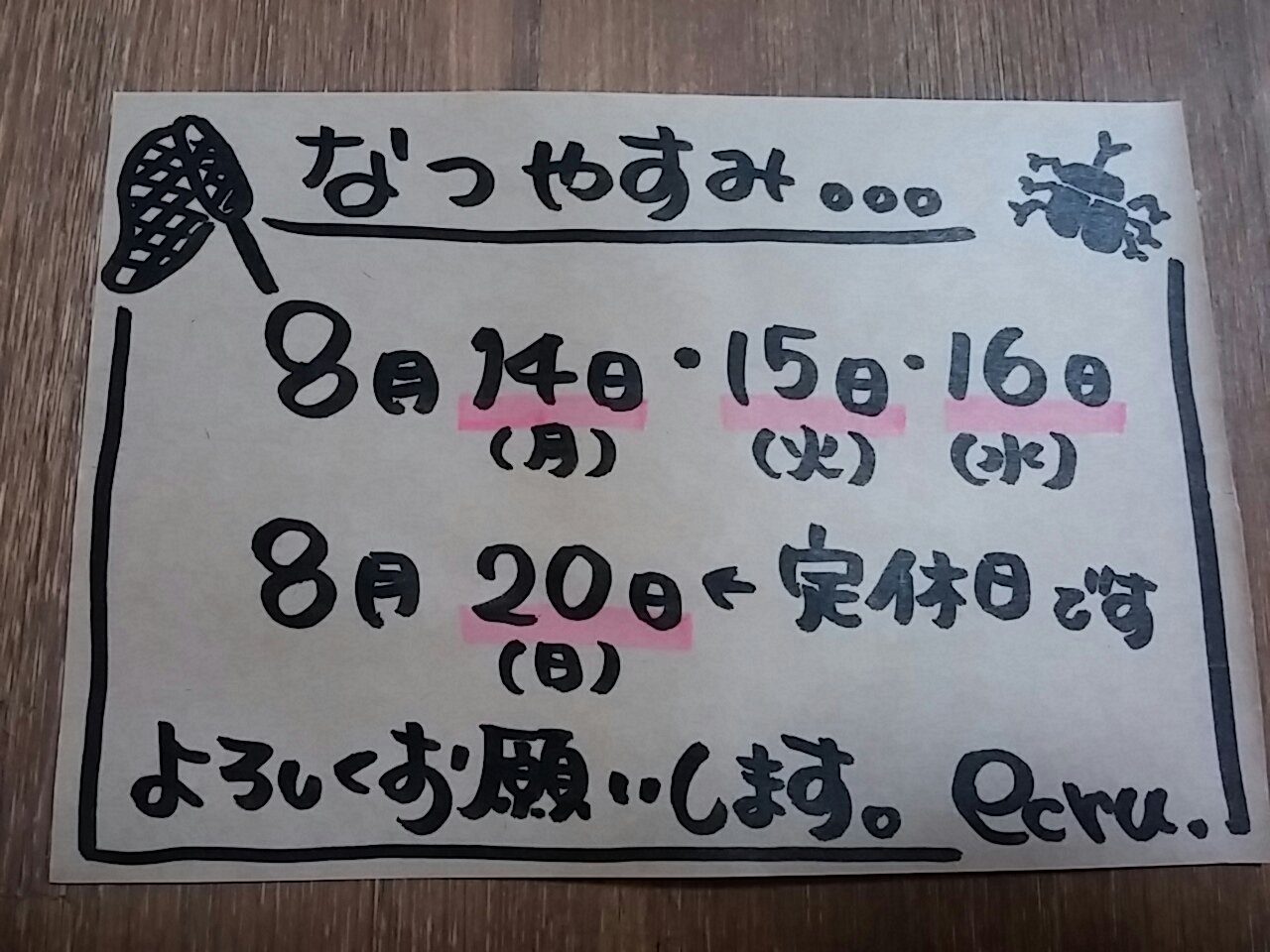 以前からお知らせしていました通り、 8月から定休日が一日増えます。 お盆休みもあり、少しわかりにくく ご迷惑もお掛けしますがよろしくお願い致します。