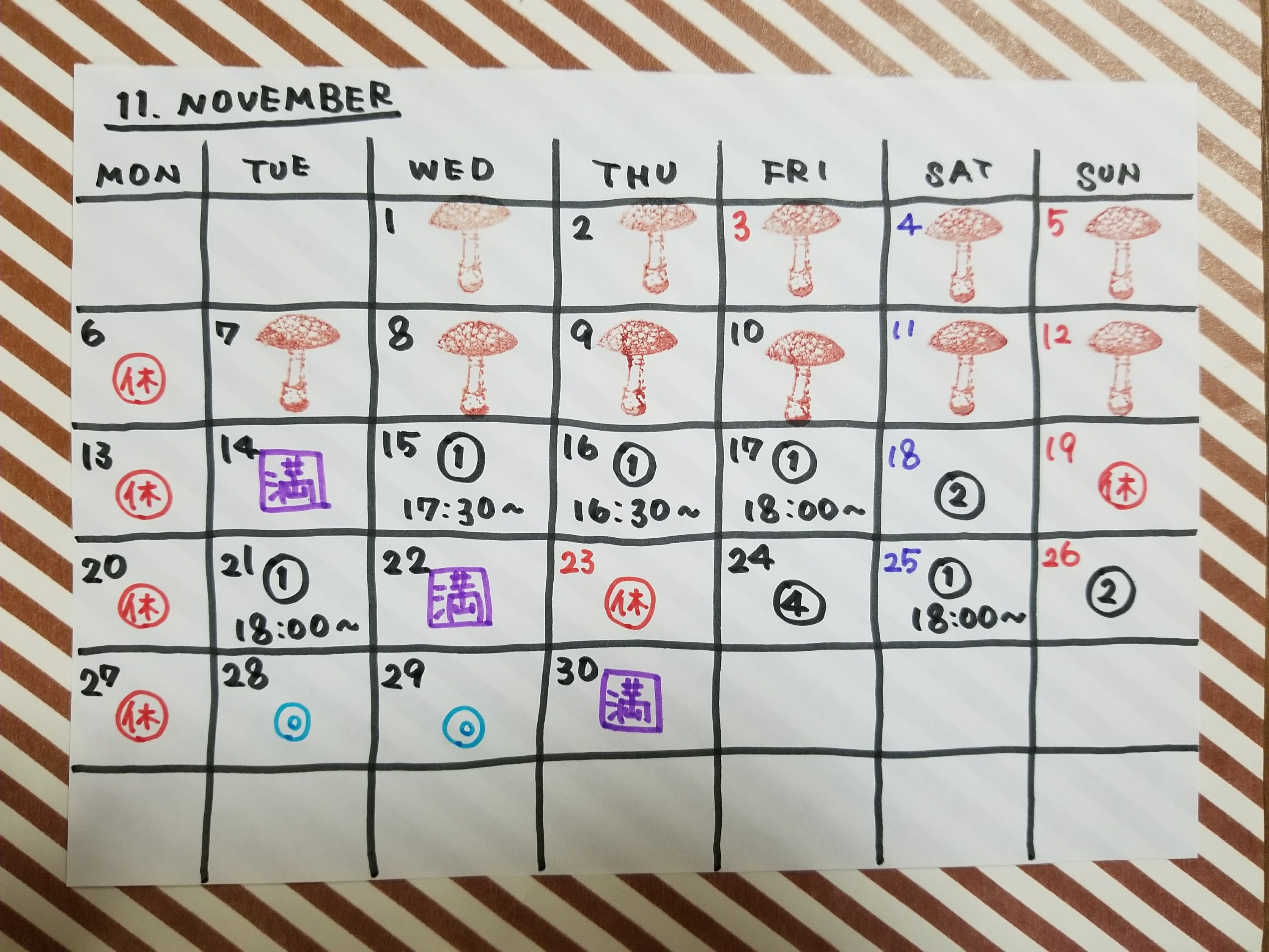 今週(11月21日~26日)は満席になりました。 ありがとうございます! 11月28日~12月末までのご予約状況です。 ナイトスパも15日まで受付中です!