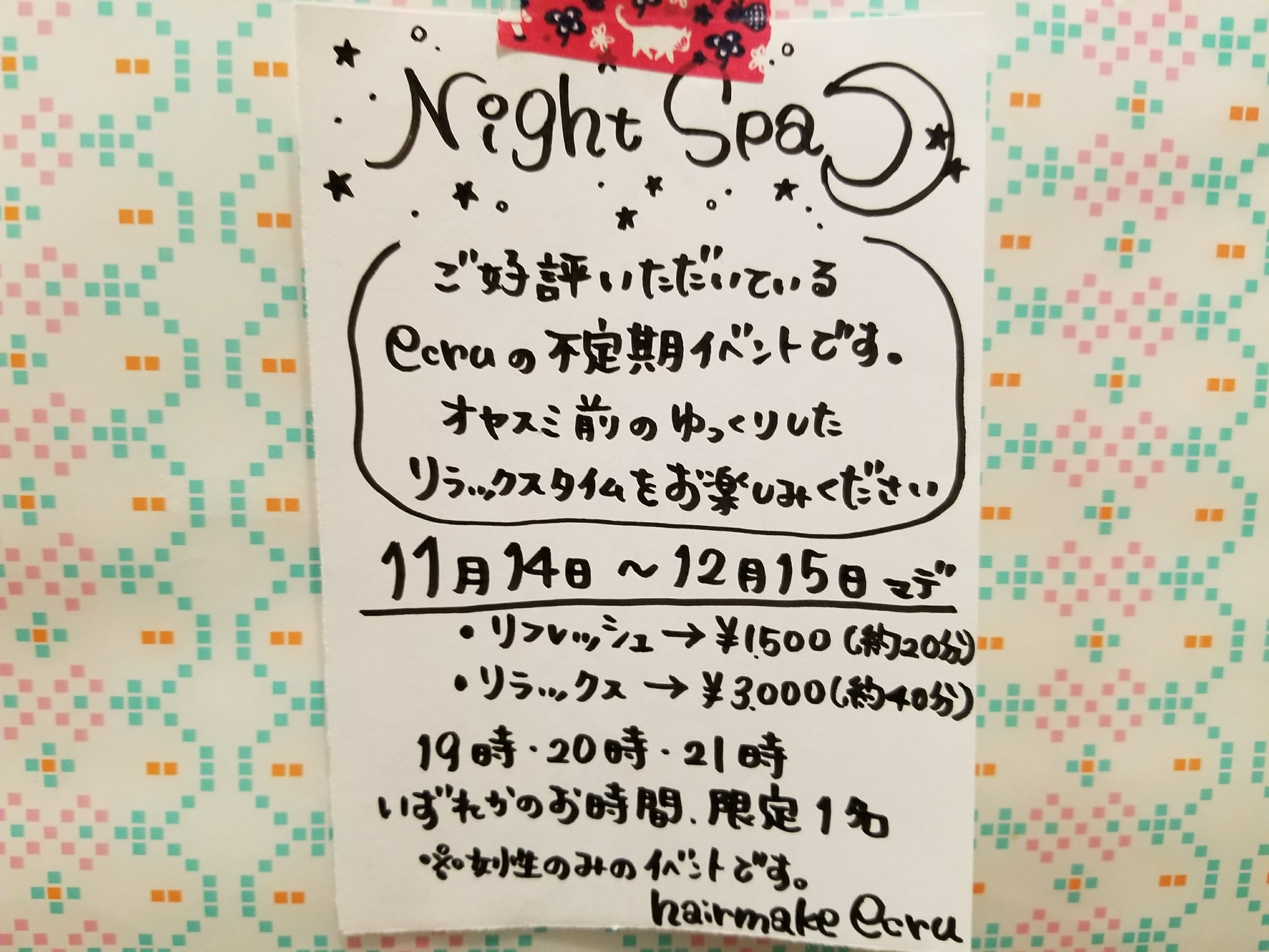 雨からのスタートですが… 今週もよろしくお願いいたします。 店内掲示ではお知らせしていたのですが、 ブログでのお知らせが遅くなりました。。。 いや、忘れておりました(ㅇㅁㅇ;;) 今年最後のナイトスパです! 12月15日までです! よろしくお願いいたしますヽ(*´∀`)ノ